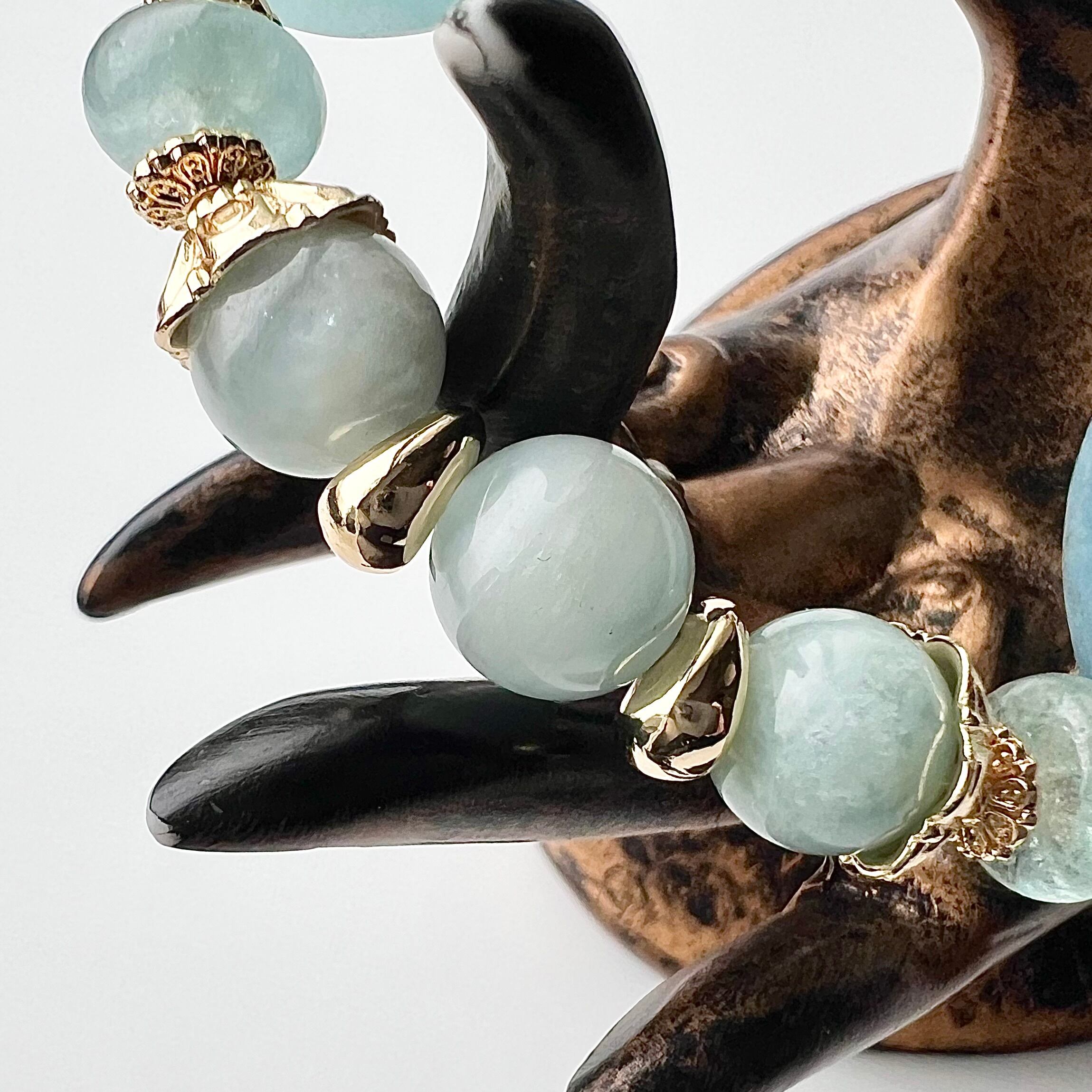他にもアクアマリンのボタンカットやゴールドパーツをバランス良く置いて、アジア圏の装飾をイメージしたブレスに仕上げたつもりです