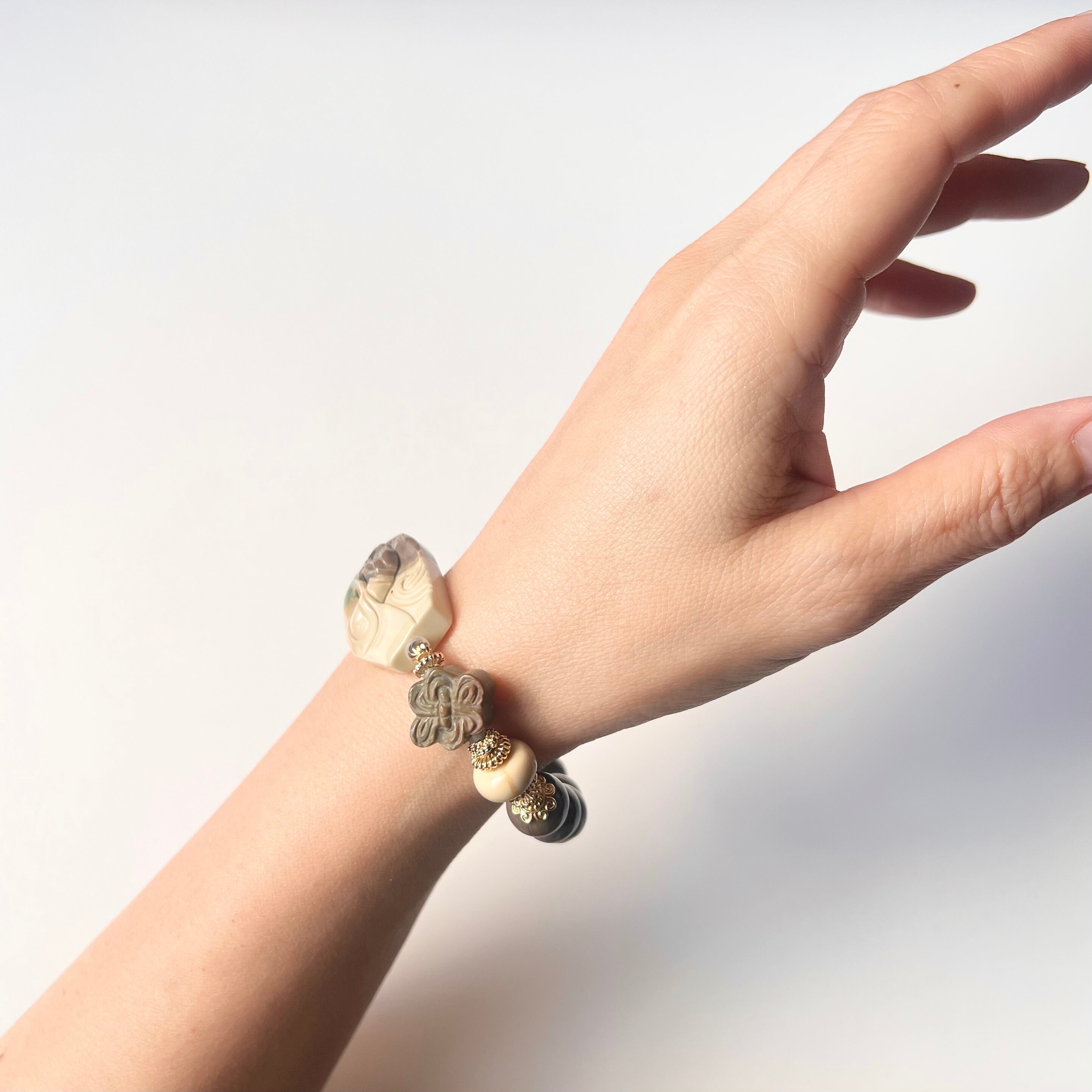 アラシャン瑪瑙の観音菩薩像ラフカットと、エンドレスノットの彫刻を用いたデザインブレスレットです