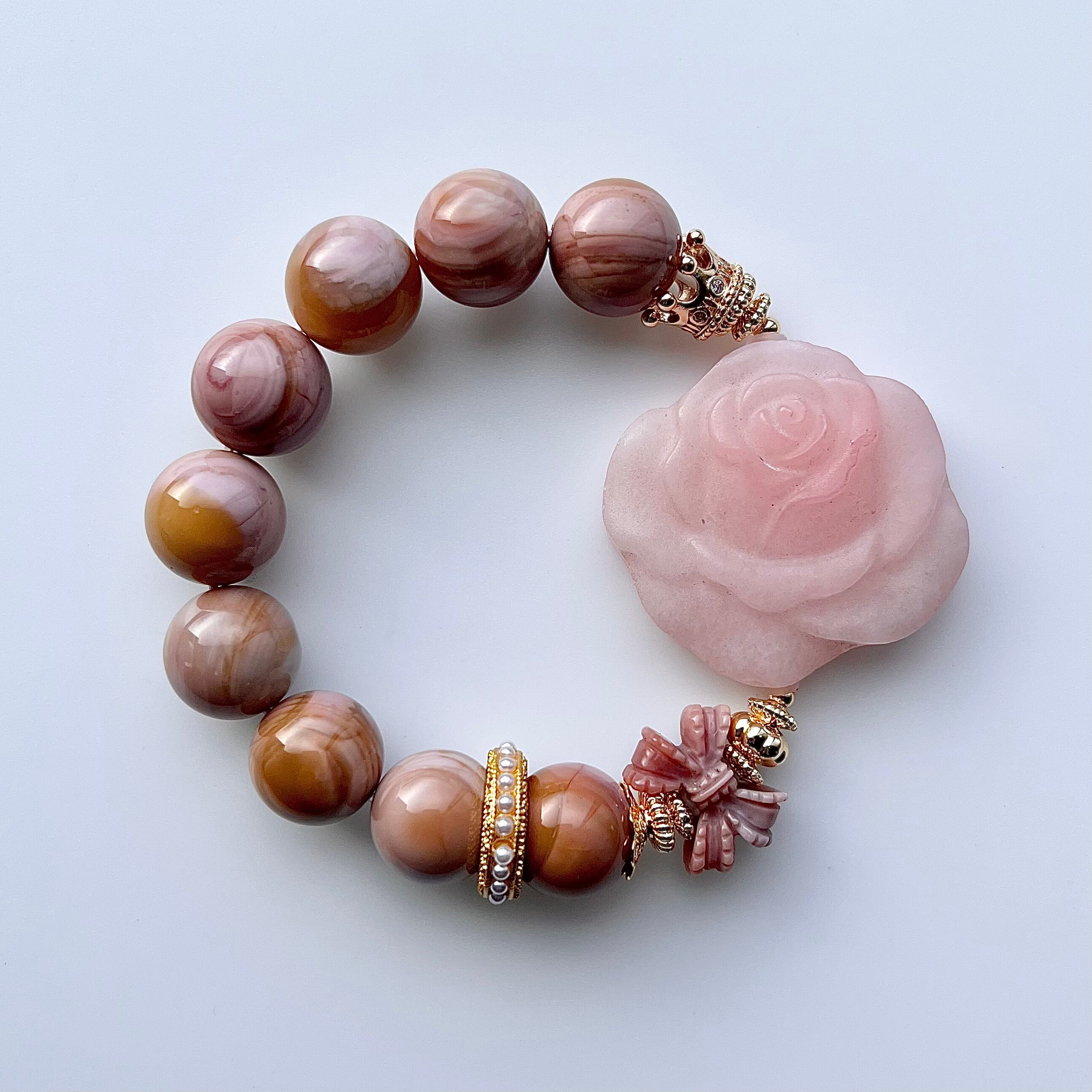ジャスパー(ピンク染め)の薔薇彫りとピンクアラシャン瑪瑙のデザインブレスレットです