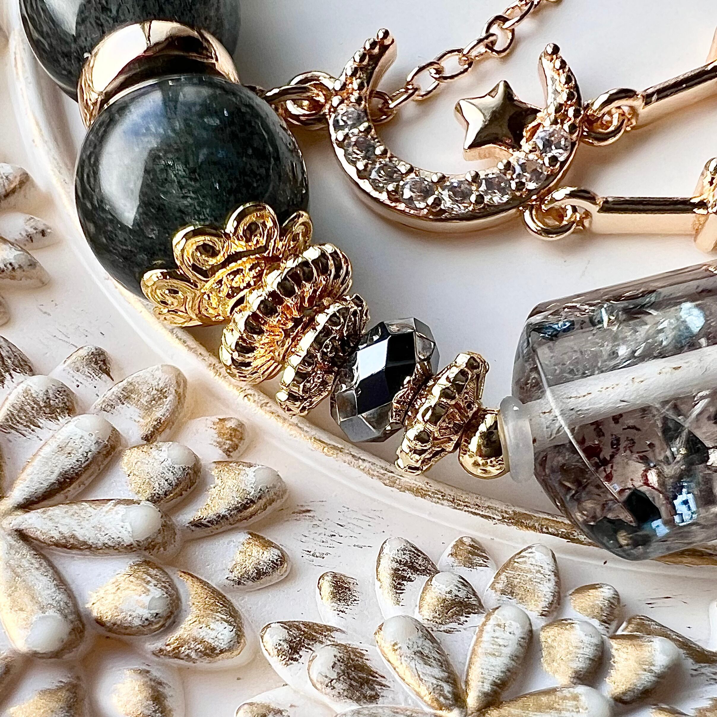 他にも三日月と星のチャームやヘマタイトのボタンカットをあしらい華やかに仕上げました